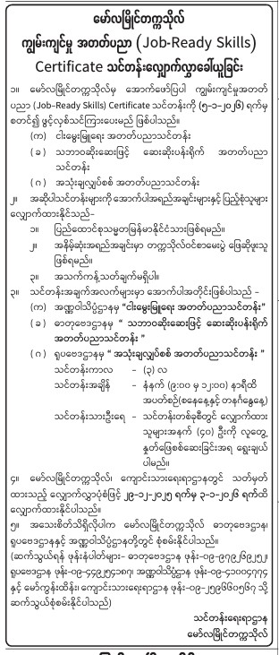 မော်လမြိုင်တက္ကသိုလ် ကျွမ်းကျင်မှုအတတ်ပညာ( Job- Ready Skills) Certificate သင်တန်းလျှောက်လွှာခေါ်ယူခြင်း December 29, 2025Uncategorized Share this article Facebook Twitter LinkedIn Email Previous Article အဝေးသင် သင်တန်းများ ကျောင်းအပ်နှံနိုင်ကြောင်း ကြေညာခြင်း You might also like အဝေးသင် သင်တန်းများ ကျောင်းအပ်နှံနိုင်ကြောင်း ကြေညာခြင်း December 22, 2025 ၂၀၂၅-၂၀၂၆ ပညာသင်နှစ် ကျောင်းသား၊ကျောင်းသူများ သိရှိနိုင်ရန် အချက်အလက်များ November 18, 2025 မော်လမြိုင်တက္ကသိုလ် ဝင်ခွင့်ရရှိသူများစာရင်း(၂၀၂၅ ခုနှစ်အောင်) November 13, 2025